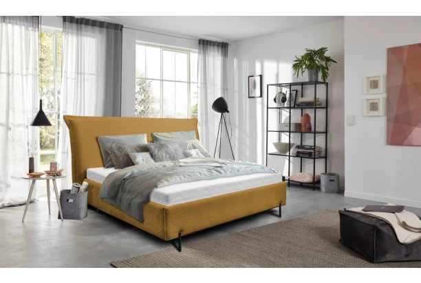 Moderní postel o velikosti lůžka 180×200 cm je očalouněna měkoučkou látkou s delším strukturovaným vlasem v barvě jantarová žlutá. Měkce polstrované zádové čelo připomíná optiku polštáře s lemem. Lůžko postele má stabilní lamelový rošt s výklopnou funkcí, pod kterým najdete úložný prostor pro ukládání například lůžkovin.