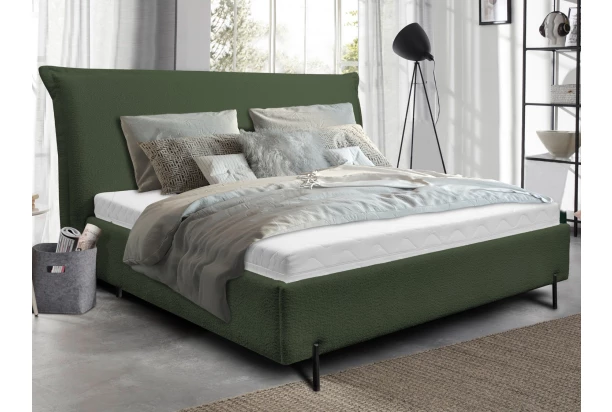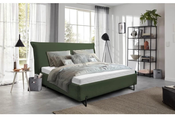 Moderní postel o velikosti lůžka 180×200 cm je očalouněna měkoučkou látkou s delším strukturovaným vlasem v barvě zelená winter moss. Měkce polstrované zádové čelo připomíná optiku polštáře s lemem. Lůžko postele má stabilní lamelový rošt s výklopnou funkcí, pod kterým najdete úložný prostor pro ukládání například lůžkovin.