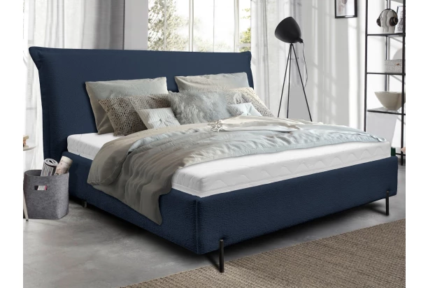 Moderní postel o velikosti lůžka 180×200 cm je očalouněna měkoučkou látkou s delším strukturovaným vlasem v barvě tmavě modrá. Měkce polstrované zádové čelo připomíná optiku polštáře s lemem. Lůžko postele má stabilní lamelový rošt s výklopnou funkcí, pod kterým najdete úložný prostor pro ukládání například lůžkovin.