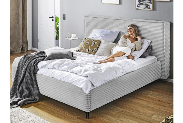 Trendová postel o velikosti lůžka 180×200 cm je očalouněna měkoučkou látkou s proužkovanou strukturou v barvě světle šedá. Zádové čelo doplňuje látkový lem a postel tak působí v prostoru ložnice velmi útulně. Lůžko postele je vybaveno stabilním lamelovým roštem s výklopnou funkcí, díky níž se dostanete úložného prostou, kam prakticky uložíte například lůžkoviny anebo věci sezónní potřeby.