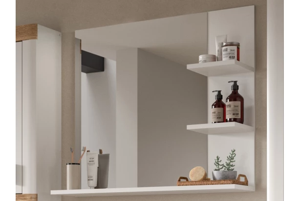 Zrcadlo s policemi z kolekce Laredo – univerzální zrcadlo na bílém panelu obsahuje 3 poličky pro praktické odkládání. Zrcadlo je tak ideální do koupelny i předsíně.