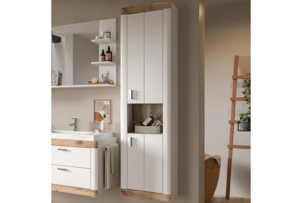 Vysoká nástěnná koupelnová skříňka z kolekce Laredo – elegantní bílý nábytek v kombinaci s dubovým dřevodekorem má okrasně rylované linie a široké přední rámy se zaoblením. Tento stylový nábytek působí na pohled masivním dojmem a dobře doplní interiery v klasickém anebo rustikálně laděném stylu, kde vytvoří příjemnou domáckou atmosféru.
