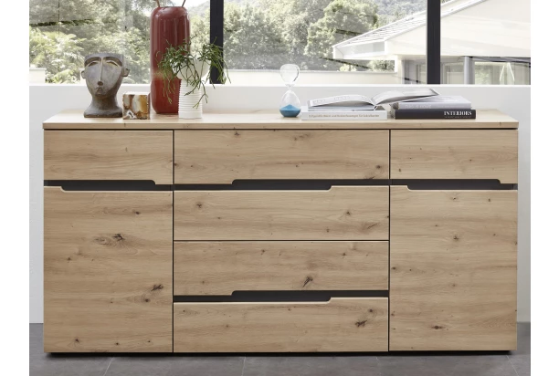 Široká komoda z programu Memphis – nábytek v moderním a zároveň funkčním designu zaujme zajímavou profilací předních ploch. Nábytek je vyroben v kontrastní kombinaci matný grafit s útulným dřevodekorem dub artisan. Tento moderní nábytek vytvoří elegantní atmosféru v interieru a zároveň prakticky poslouží v každé domácnosti. Komoda o šířce 165 cm disponuje čtyřmi zásuvkami a dvěma dveřmi, které zajišťují přehledné uspořádání uložených věcí.