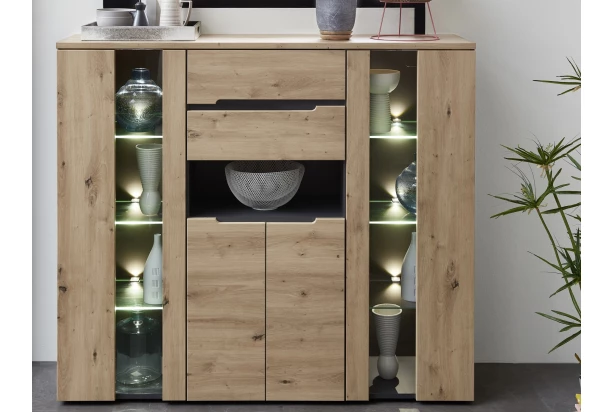 Vysoká komoda s osvětlením z programu Memphis – nábytek v moderním a zároveň funkčním designu zaujme zajímavou profilací předních ploch. Nábytek je vyroben v kontrastní kombinaci matný grafit s útulným dřevodekorem dub artisan. Tento moderní nábytek vytvoří elegantní atmosféru v interieru a zároveň prakticky poslouží v každé domácnosti. Vysoká komoda o šířce 145 cm má 2 zásuvky v horní části a 4 otočná dvířka. Dvě z nich disponují čirými skly, ideální pro prezentaci dekorací nebo nádobí. Bílé LED osvětlení polic s neutrálním tónem efektivně zvýrazňuje a rozjasňuje veškeré vystavené doplňky.