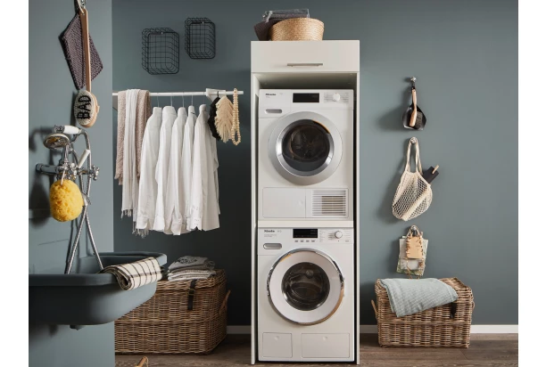 - otevřený dolní prostor (volná šířka 64,2 cm, volná výška 180 cm, pro umístění pračky a sušičky nad sebe)