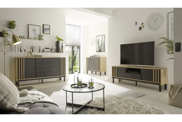 Komoda se zásuvkami z programu Volano – moderní nábytek v kontrastní kombinaci dřevodekoru dub artisan s černými plochami navíc doplňují lamely na předních plochách. Nábytek tak působí zajímavým a nezaměnitelným dojmem. Černá vyšší podnož naopak umožňuje snazší údržbu podlahy pod nábytkem.