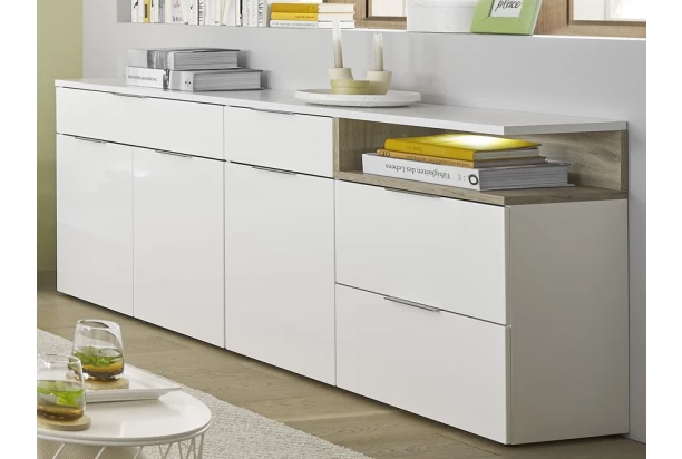 Široká komoda z kolekce Beatrix – moderní bílý nábytek s lesklými předními plochami doplňuje zajímavě řešená odkládací přihrádka v kontrastním dřevodekoru dub viking. Prostor uvnitř přihrádky je navíc vybaven bodovým osvětlením, které nábytek ještě více zvýrazňuje.