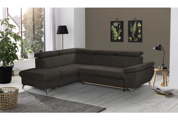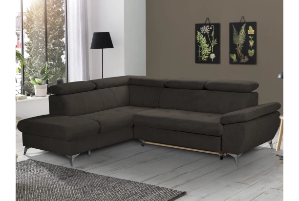 Moderní rohová sedací souprava v trendovém stylu nabízí komfortní sezení, které navíc doplňují polohovatelné područky a polohovatelné zádové opěrky – snadno si tak můžete přizpůsobit styl sezení podle Vaší individuální potřeby. Rohová sedačka tvoří levý roh a je očalouněna příjemně měkkou strukturovanou látkou v odstínu tmavě hnědá espresso. Kovová podnož v chromově lesklém provedení působí vzdušně a navíc umožňuje využít i váš robotický vysavač. Tato sedačka je zároveň vybavena rozkládací funkcí na příležitostné lůžko a také úložným prostorem pod otomanem. Zkrátka sedačka pro komfortní, moderní a zároveň praktickou domácnost.