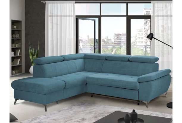 Moderní rohová sedací souprava v trendovém stylu nabízí komfortní sezení, které navíc doplňují polohovatelné područky a polohovatelné zádové opěrky – snadno si tak můžete přizpůsobit styl sezení podle Vaší individuální potřeby. Rohová sedačka tvoří levý roh a je očalouněna příjemně měkkou strukturovanou látkou v odstínu modrá. Kovová podnož v chromově lesklém provedení působí vzdušně a navíc umožňuje využít i váš robotický vysavač. Tato sedačka je zároveň vybavena rozkládací funkcí na příležitostné lůžko a také úložným prostorem pod otomanem. Zkrátka sedačka pro komfortní, moderní a zároveň praktickou domácnost.