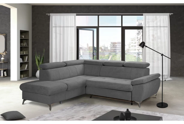 Moderní rohová sedací souprava v trendovém stylu nabízí komfortní sezení, které navíc doplňují polohovatelné područky a polohovatelné zádové opěrky – snadno si tak můžete přizpůsobit styl sezení podle Vaší individuální potřeby. Rohová sedačka tvoří levý roh a je očalouněna příjemně měkkou strukturovanou látkou v odstínu kamenná středně šedá. Kovová podnož v chromově lesklém provedení působí vzdušně a navíc umožňuje využít i váš robotický vysavač. Tato sedačka je zároveň vybavena rozkládací funkcí na příležitostné lůžko a také úložným prostorem pod otomanem. Zkrátka sedačka pro komfortní, moderní a zároveň praktickou domácnost.