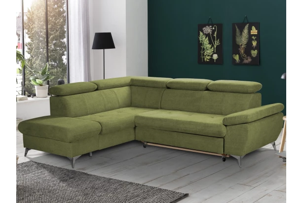Moderní rohová sedací souprava v trendovém stylu nabízí komfortní sezení, které navíc doplňují polohovatelné područky a polohovatelné zádové opěrky – snadno si tak můžete přizpůsobit styl sezení podle Vaší individuální potřeby. Rohová sedačka tvoří levý roh a je očalouněna příjemně měkkou strukturovanou látkou v odstínu zelená. Kovová podnož v chromově lesklém provedení působí vzdušně a navíc umožňuje využít i váš robotický vysavač. Tato sedačka je zároveň vybavena rozkládací funkcí na příležitostné lůžko a také úložným prostorem pod otomanem. Zkrátka sedačka pro komfortní, moderní a zároveň praktickou domácnost.