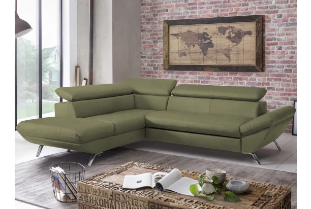 Rohová sedací souprava zaujme moderním designem tvarů. Oceníte pohodlné sezení, které doplňují polohovatelné zádové opěrky, díky kterým si přizpůsobíte styl sezení podle aktuální potřeby. Rohová sedačka s otomanem tvoří levý roh a je očalouněna jemně strukturovanou látkou v odstínu olivově zelená. Pod otomanem najdete praktický úložný prostor. Sedačku můžete díky rozkládací funkci snadno proměnit na lůžko pro příležitostné spaní. Moderní kovová podnož koresponduje s tvary sedačky a umožňuje využít během úklidu i váš robotický vysavač. Tato pohodlná rohová sedačka rozměrově dobře pasuje i do menšího prostoru obýváku.