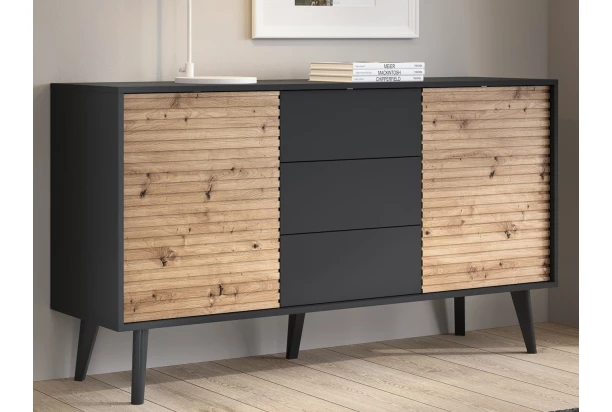 Široká komoda se zásuvkami z kolekce Willow – černý nábytek v kombinaci se strukturovanými povrchy v dřevodekoru dub artisan působí v interieru nejen zajímavě, ale zároveň i útulně. Černé nohy z masivního dřeva dodávají stabilitu a přitom umožňují snadnou údržbu podlahy. Nábytek je tak moderní, atraktivní na pohled a zároveň praktický.