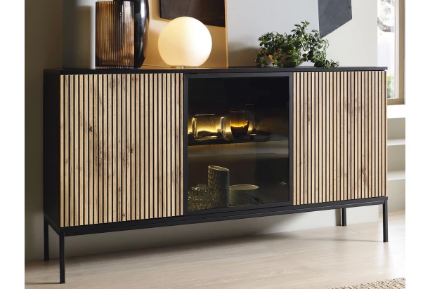 Široká skříňka z kolekce Sento – stylový nábytek pro ty, kteří chtějí mít interier zařízený moderně, prakticky a zároveň útulně. Černé povrchy doplňují útulné tóny dubového dřevodekoru s profilací, která vytváří na předních plochách zajímavý lamelový efekt. Černý rám prosklení dokonale pasuje k černé kovové podnoži. Díky zvýšené podnoži tak může být pro vás údržba podlahy snazší. Vnitřní prosklený prostor s osvětlením doplňuje příjemnou večerní atmosféru.