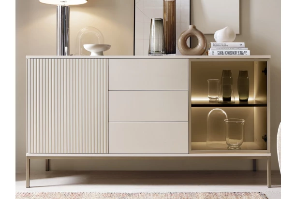 Komoda se zásuvkami z kolekce Sento – stylový nábytek pro ty, kteří chtějí mít interier zařízený moderně, prakticky a zároveň útulně. Jemné kašmírově béžové povrchy doplňuje profilace, která vytváří na předních plochách zajímavý lamelový efekt. Rám prosklení z kovu v elegantním odstínu šampaň dokonale ladí s kovovou podnoží ve stejném tónu. Díky zvýšené podnoži tak může být pro vás údržba podlahy snazší. Vnitřní prosklený prostor s osvětlením doplňuje příjemnou večerní atmosféru.