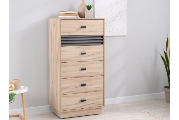 Komoda se zásuvkami z kolekce Ancona – zajímavý design nábytku ozvláštňuje antracitová struktura lamel, která vyniká v kontrastu se světlými plochami dubového dřevodekoru. Tento nábytek upoutá pozornost na pohled a zároveň plní svůj praktický účel.