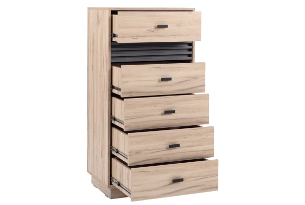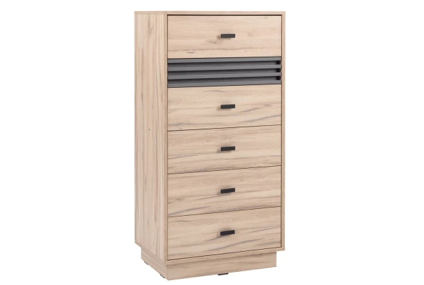 Komoda se zásuvkami z kolekce Almo – zajímavý design nábytku ozvláštňuje antracitová struktura lamel, která vyniká v kontrastu se světlými plochami dubového dřevodekoru. Tento nábytek upoutá pozornost na pohled a zároveň plní svůj praktický účel.