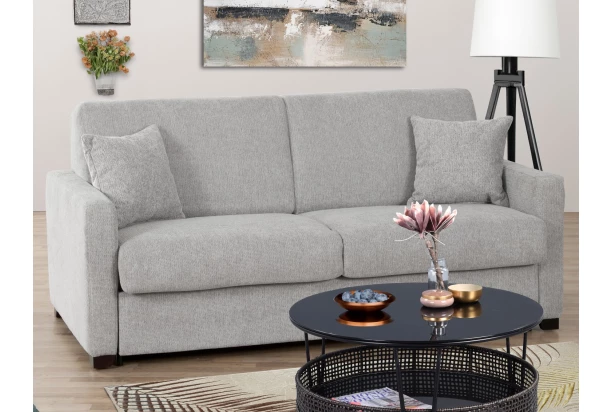 Rozkládací pohovku na trvalé spaní snadno rozložíte a během chvíle proměníte na dvoulůžkovou postel s matrací o ploše 140×195 cm. Tato pohovka je skvělá i do malého bytu nebo garsonky, kde poslouží i jako každodenní plnohodnotné lůžko. Očalouněna strukturovanou žinilkovou látkou v odstínu světle šedá. Včetně dvou doplňkových polštářků.