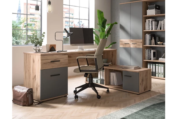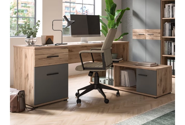Rohový psací stůl z kolekce Mason – moderní a praktický nábytek v kombinaci dubového dřevodekoru a šedých ploch ozvláštňují horizontálně frézované linie, které dodávají nábytku zajímavý efekt. Rohový psací stůl se svými velkorysými rozměry stran 170 cm/151 cm nabízí dostatek prostoru pro efektivní pracovní prostředí. Rohová konstrukce ve tvaru L lze univerzálně smontovat jako pravý anebo levý roh – maximalizujete tak využití dostupného prostoru v místnosti. Rohový psací stůl je ideální do pracovny i dětského pokoje, kde nabízí praktické i estetické řešení pro práci. Jeho moderní design a vysoká kvalita zpracování z něj dělají funkční a stylový kus nábytku do vašeho pracovního prostředí.