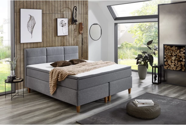 Postel typu boxspring v trendovém stylu má vysoké lůžko o velikosti 180×200 cm, které je vybaveno dvěma vrstvami matrací a navíc horním topperem pro komfortní spaní. Postel má stabilní konstrukci a je očalouněna polyesterovou tkaninou v barvě šedá – zádové čelo je navíc zvýrazněno dvojitým proševem. K útulnému prostředí vaší ložnice se budou hodit nožky v optice dubového dřeva.