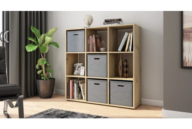 Praktický regál s 9 přihrádkami je vyroben v dekoru dub artisan a můžete ho umístit podélně anebo kolmo ke stěně. Otevřené přihrádky lze navíc doplnit například úložnými boxy, do kterých snadno uložíte různé drobnosti.