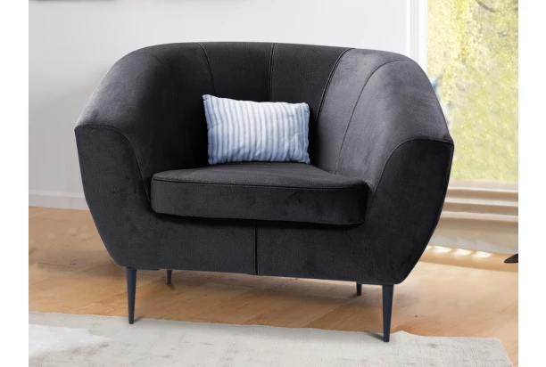 Elegantní křeslo na černých kovových nohách působí vzdušně a pasuje téměř do jakéhokoliv interieru. Toto pohodlně polstrované křeslo má ergonomicky zaoblené boční područky a je očalouněno atraktivní sametovou látkou v odstínu tmavě šedá, která je na dotek hladká, příjemně hebká a zároveň odolná, navíc díky lesklému efektu působí luxusním dojmem.