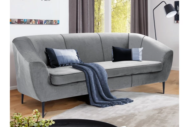 Elegantní trojmístná pohovka na černých kovových nohách působí vzdušně a pasuje téměř do jakéhokoliv interieru. Tato pohodlně polstrovaná pohovka má ergonomicky zaoblené boční područky a je očalouněna atraktivní sametovou látkou v odstínu světle šedá, která je na dotek hladká, příjemně hebká a zároveň odolná, navíc díky lesklému efektu působí luxusním dojmem.
