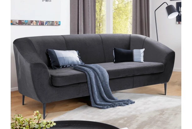 Elegantní trojmístná pohovka na černých kovových nohách působí vzdušně a pasuje téměř do jakéhokoliv interieru. Tato pohodlně polstrovaná pohovka má ergonomicky zaoblené boční područky a je očalouněna atraktivní sametovou látkou v odstínu tmavě šedá, která je na dotek hladká, příjemně hebká a zároveň odolná, navíc díky lesklému efektu působí luxusním dojmem.