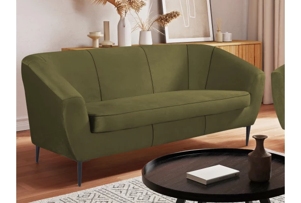 Elegantní trojmístná pohovka na černých kovových nohách působí vzdušně a pasuje téměř do jakéhokoliv interieru. Tato pohodlně polstrovaná pohovka má ergonomicky zaoblené boční područky a je očalouněna atraktivní sametovou látkou v odstínu mechově zelená, která je na dotek hladká, příjemně hebká a zároveň odolná, navíc díky lesklému efektu působí luxusním dojmem.