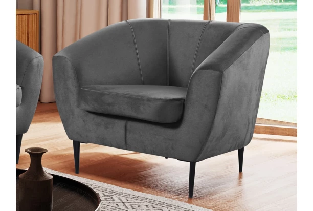 Elegantní křeslo na černých kovových nohách působí vzdušně a pasuje téměř do jakéhokoliv interieru. Toto pohodlně polstrované křeslo má ergonomicky zaoblené boční područky a je očalouněno atraktivní sametovou látkou v odstínu středně šedá, která je na dotek hladká, příjemně hebká a zároveň odolná, navíc díky lesklému efektu působí luxusním dojmem.