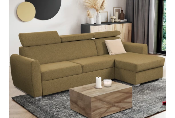 Pohodlná rohová sedací souprava se rozměrově hodí i do malého prostoru, kde nabídne pohodlně měkké sezení s polohovatelnými opěrkami hlavy. Sedačka je očalouněna odolnou látkou v barvě žluto-hnědá a lze univerzálně smontovat jaké pravý nebo levý roh. Pod otomanem najdete praktický úložný prostor. Funkci rozkladu pro příležitostné spaní využijete při odpočinku anebo třeba vaše víkendová návštěva.