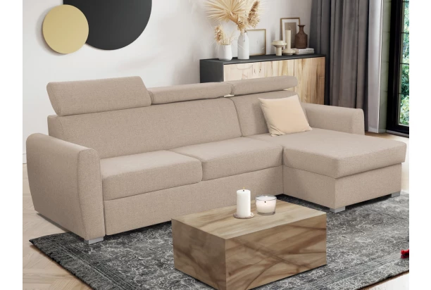 Pohodlná rohová sedací souprava se rozměrově hodí i do malého prostoru, kde nabídne pohodlně měkké sezení s polohovatelnými opěrkami hlavy. Sedačka je očalouněna odolnou látkou v barvě světlá hnědo-béžová a lze univerzálně smontovat jaké pravý nebo levý roh. Pod otomanem najdete praktický úložný prostor. Funkci rozkladu pro příležitostné spaní využijete při odpočinku anebo třeba vaše víkendová návštěva.