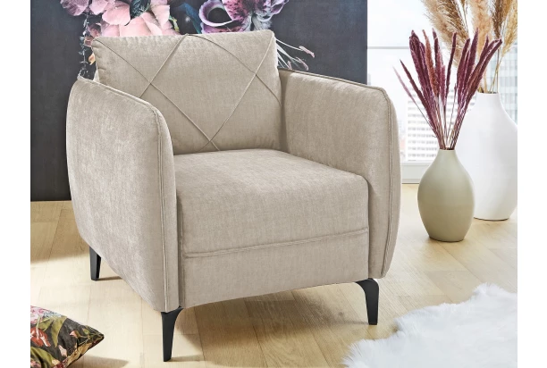 Křeslo s pohodlným vypolstrováním a opěrným polštářem se hodí do každého obýváku. Toto křeslo je očalouněno jemně strukturovanou žinilkovou látkou v barvě světle béžová a doplněno proševem. Černé kovové nožky působí v interieru vzdušně a usnadní vám údržbu podlahy.