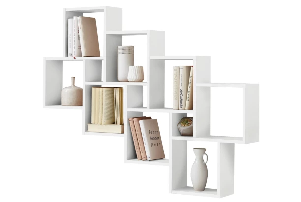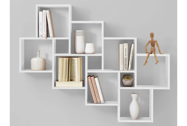 Nástěnný regál v bílé barvě má zajímavě členitou konstrukci, která obsahuje celkem 11 přihrádek o dvou různých velikostech. Tento praktický regál prakticky poslouží na knížky, dekorace nebo jakékoliv drobné předměty.