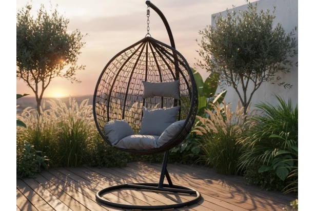 Závěsné křeslo z kovu a propletené imitace černého ratanu je oblíbeným doplňkem na zahradě domu anebo kdekoliv na venkovní terase. Křeslo obsahuje měkký členitý polštář a podhlavník pro vytvoření pohodové atmosféry během posezení anebo pohodového houpání v přírodě. Toto křeslo můžete umístit například i do interieru zimní zahrady.