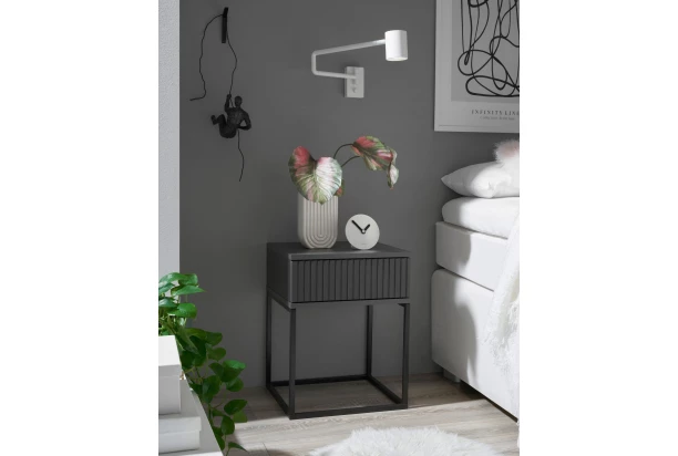 Noční stolek na černé kovové podnoži zaujme na pohled moderním designem. Stolek s 1 zásuvkou je vyroben v tmavě šedém grafitovém provedení a přední plochy zásuvky doplňuje profilace, která vytváří na předních plochách zajímavý lamelový efekt. Tento noční stolek o 40 cm šířce lze snadno umístit také do prostoru malé ložnice. Stolek můžete případně využít i jako odkládací nebo přístavný stolek kdekoliv v prostoru vašeho moderního interieru.
