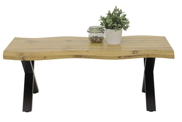 Prostorný konferenční stolek o velikosti 110×60 cm zaujme optikou masivního dřeva s opracovanými hranami do zaoblených tvarů – horní deska tak působí jako kus masivního dřeva. Vyroben v dřevodekoru divoký dub v kombinaci s černou kovovou podnoží ve tvaru X.