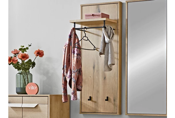 Nástěnný šatní panel o výšce 116 cm z kolekce Perado – nábytek v útulném dřevodekoru dub evoke dodává předsíni nebo vstupnímu prostoru přirozeně působící elegantní vzhled, který se hodí do různých stylově zařízených interierů. Nábytek zároveň vytváří příjemně hřejivou domáckou atmosféru. Šatní panel s tyčí, závěsnými háčky a policí nabízí praktické zavěšení bund, kabátů, šátků a dalších doplňků. Vysoce kvalitní materiály a pečlivé zpracování zajišťují odolnost a stabilitu, povrchy se snadno udržují a lze je snadno čistit lehce navlhčeným hadříkem. Tento nábytek je praktický a zároveň vytváří elegantní a nadčasový vzhled v místnosti.