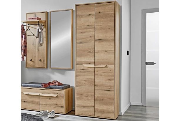 Předsíňová šatní skříň z kolekce Perado – nábytek v útulném dřevodekoru dub evoke dodává předsíni nebo vstupnímu prostoru přirozeně působící elegantní vzhled, který se hodí do různých stylově zařízených interierů. Nábytek zároveň vytváří příjemně hřejivou domáckou atmosféru. Uvnitř skříně najdete šatní tyč pro zavěšení ošacení a police pro odkládání botů, doplňků nebo drobného prádla. Vysoce kvalitní materiály a pečlivé zpracování zajišťují odolnost a stabilitu, povrchy se snadno udržují a lze je snadno čistit lehce navlhčeným hadříkem. Tento nábytek je praktický a zároveň vytváří elegantní a nadčasový vzhled v místnosti.