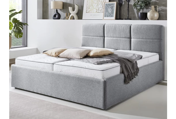 Trendová dvoulůžková postel o velikosti 180×200 cm se hodí do každé moderně zařízené ložnice. Postel je očalouněna látkou v barvě světle šedá a zádové čelo má doplněno okrasným dvojitým proševem. Při kombinaci s výklopným roštem lze dolní prostor pod lůžkem využít i pro praktické ukládání různých věcí. Tato postel má také kompaktní rozměry konstrukce a proto nezabere zbytečně příliš místa v prostoru ložnice – je tedy dobrou volnou i do menšího prostoru.