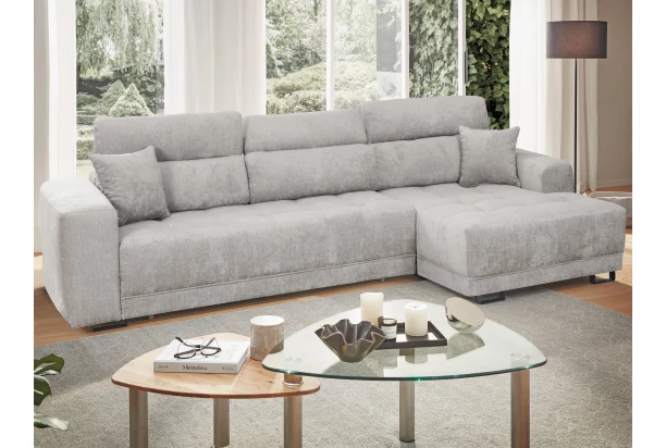 Tato rohová sedačka osloví příjemným komfortem, který doplňují zádové opěrky s funkcí polohování. Tato sedací souprava s otomanem tvoří pravý roh a je očalouněna měkkoučkou žinilkovou látkou v barvě světle šedá. Potah kvalitně vypolstrovaného sedáku je doplněn okrasným proševem. Varianta sedačky bez elektrické funkce nastavení hloubky sedu.