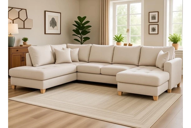 Elegantní sedací souprava ve tvaru levé U nabízí komfortní sezení, které si oblíbí celá rodina. Sedačka je očalouněna měkkou strukturovanou látkou v barvě krémová. Příjemně měkké sedáky s okrasným proševem mají kvalitní výplň ze studené pěny a pohodlní sedačky doplňují velké opěrné polštáře a tři menší polštářky. Stabilní nožky z masivního dubového dřeva působí navíc velmi útulně. Tato varianta sedačky je vybavena funkcí rozkladu na příležitostné lůžko a praktickým úložným prostorem pod otomanem.