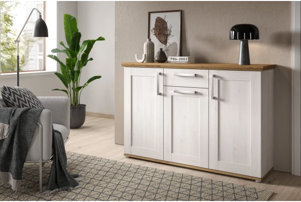 Širší komoda se zásuvkou z programu Verona – elegantní nábytek v kombinaci běleného sibiřského modřínu a dubu artisan má okrasné reliéfy a v každém interieru vytvoří příjemnou domáckou atmosféru s rustikálním nádechem. Komoda o šířce 137 cm má 1 šuplík a 3 dveře, za kterými najdete police pro ukládání nejrůznějších předmětů nebo oblečení. Snadno udržovatelné povrchy lze čistit lehce navlhčeným hadříkem pro odstranění prachu a nečistot. Tato skříňka prakticky poslouží v obýváku, jídelně, ložnici, předsíni anebo kdekoliv jinde, kde potřebujete ukládat věci.