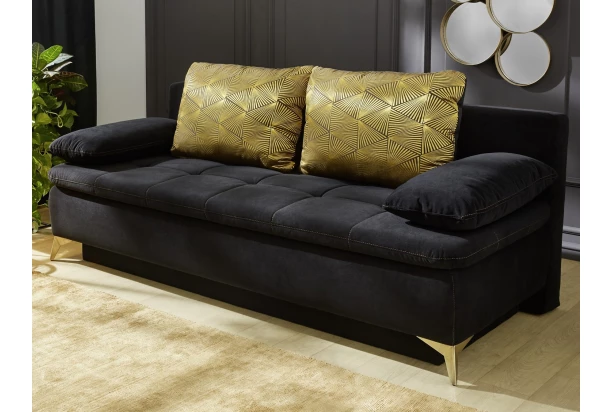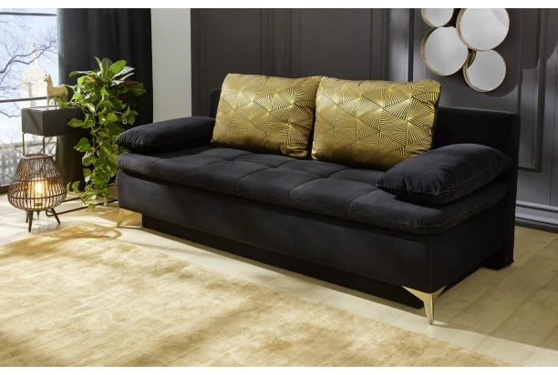 Pohovka v elegantním glamour stylu je očalouněna sametově hebkou látkou v barvě černá. Velké opěrné polštáře s leskle zlatým geometrickým motivem zaujmou na pohled. Barevně sladěné prošívání a kovové nožičky v mosazně zlaté barvě dotvářejí jedinečný design. Tato pohovka nabízí také úložný prostor a funkci rozkladu na lůžko pro hosty. Polstrování z polyuretanové pěny v kombinaci s vlnovcovými pružinami zajišťuje příjemné pohodlí během sezení a ležení.