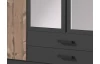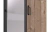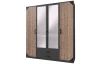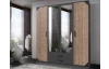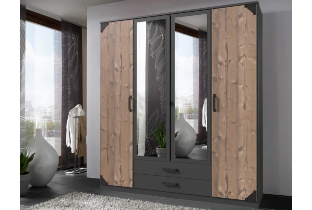 Šatní skříň o šířce 180 cm má zajímavý industriální design a skvěle se hodí do stylově zařízené ložnice, šatny či předsíně. Tmavé grafitové plochy doplňuje dřevodekor jedle a imitace černých kovových prvků, které zaujmou na pohled. Tato skříň obsahuje 4 otočné dveře, praktická zrcadla a zásuvky.