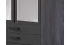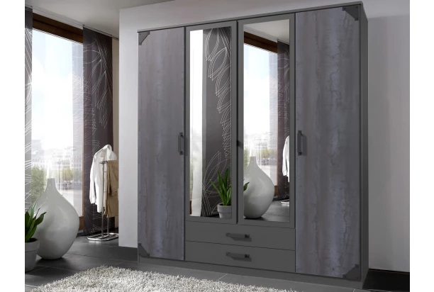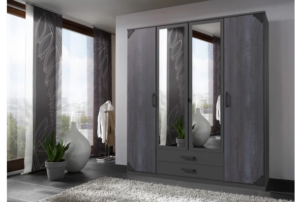 Šatní skříň o šířce 180 cm má zajímavý industriální design a skvěle se hodí do stylově zařízené ložnice, šatny či předsíně. Tmavé grafitové plochy doplňuje imitace šedé vintage oceli a černých kovových prvků, které zaujmou na pohled. Tato skříň obsahuje 4 otočné dveře, praktická zrcadla a zásuvky.