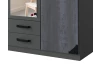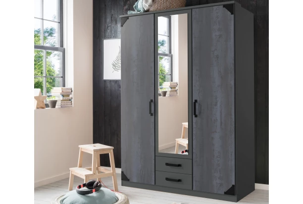 Šatní skříň o šířce 135 cm má zajímavý industriální design a skvěle se hodí do stylově zařízené ložnice, šatny či předsíně. Tmavé grafitové plochy doplňuje imitace šedé vintage oceli a černých kovových prvků, které zaujmou na pohled. Tato skříň obsahuje 3 otočné dveře, praktické zrcadlo a zásuvky.