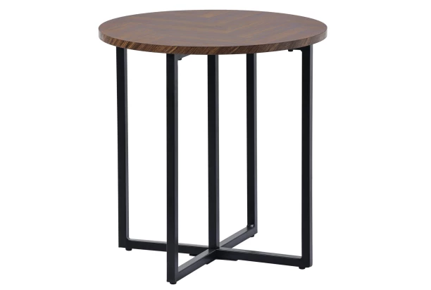 Stylový odkládací stolek s parketovým vzorem dřeva zaujme v interieru a poslouží pro všestranné odkládání věcí nebo pro umístění lampičky, vázy s kytkou anebo třeba dekorací. Kulatá odkládací plocha o průměru 52 cm je umístěna na černé kovoé podnoži, která dává stolku velmi dobrou pevnost a stabilitu.
