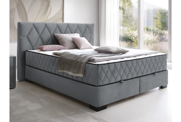 Krásná manželská postel o velikosti lůžka 180×200 cm zaujme stylovým proševem a v prostoru ložnice působí velmi luxusně. Postel je očalouněna odolnou látkou v optice lesklého sametu v odstínu holubí šedá. O pohodlí spánku se postarají kvalitní vysoké matrace s taštičkovým jádrem, které zajistí optimální komfort během spaní. Díky vyšší poloze lůžka je tak vstávání z postele snazší. Praktický úložný prostor ve spodní části postele je snadno přístupný z přední strany postele a poslouží například pro uschování lůžkovin anebo sezónních věcí.