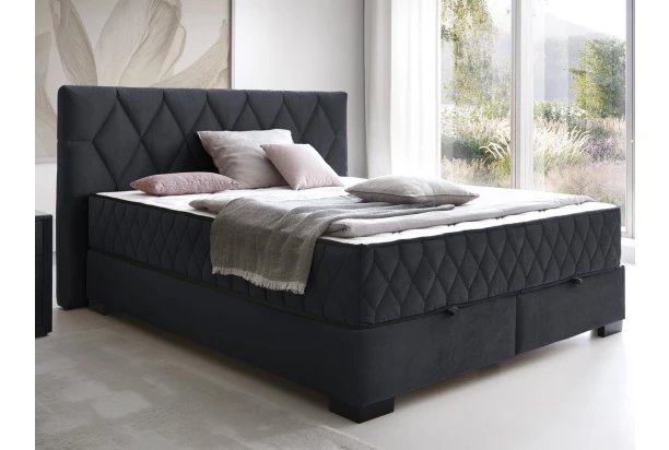 Krásná manželská postel o velikosti lůžka 180×200 cm zaujme stylovým proševem a v prostoru ložnice působí velmi luxusně. Postel je očalouněna odolnou látkou v optice lesklého sametu v odstínu tmavě šedá. O pohodlí spánku se postarají kvalitní vysoké matrace s taštičkovým jádrem, které zajistí optimální komfort během spaní. Díky vyšší poloze lůžka je tak vstávání z postele snazší. Praktický úložný prostor ve spodní části postele je snadno přístupný z přední strany postele a poslouží například pro uschování lůžkovin anebo sezónních věcí.